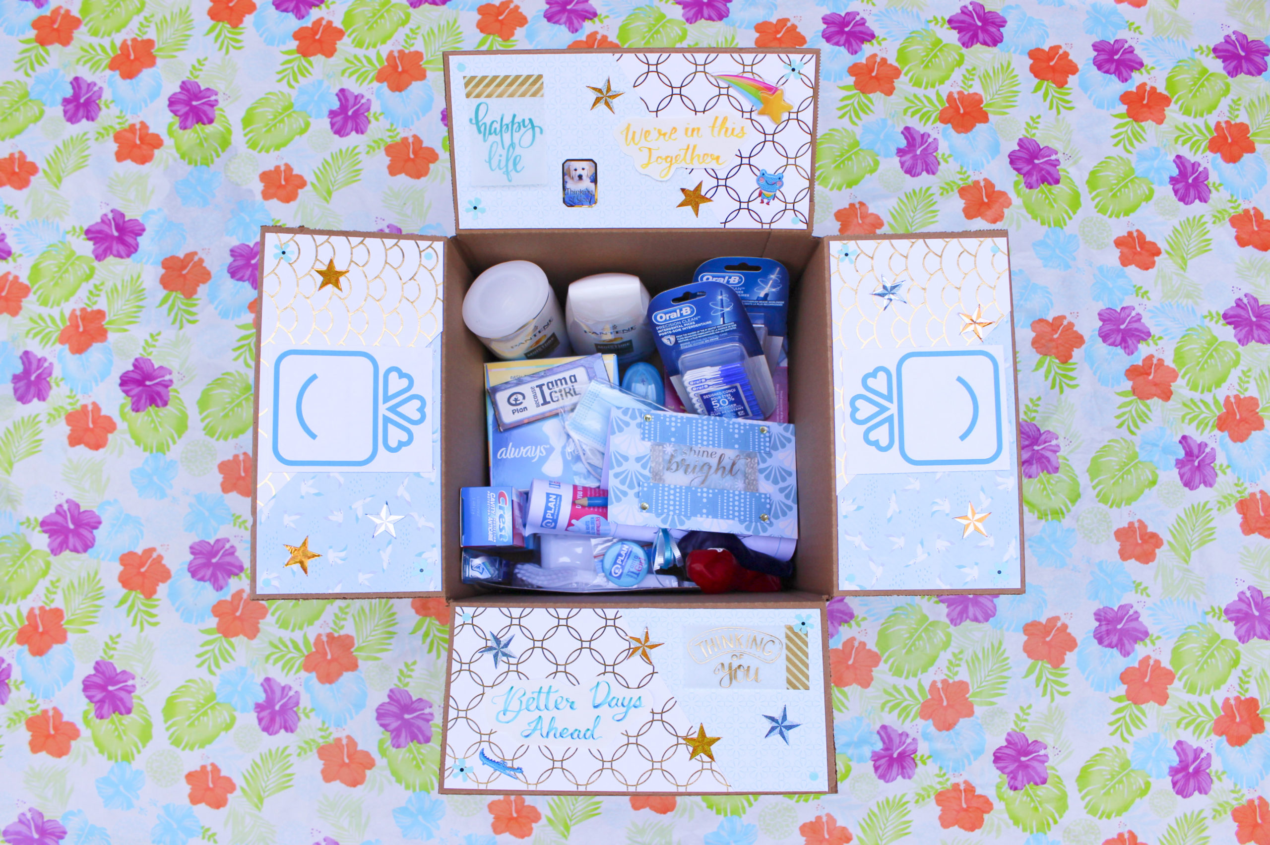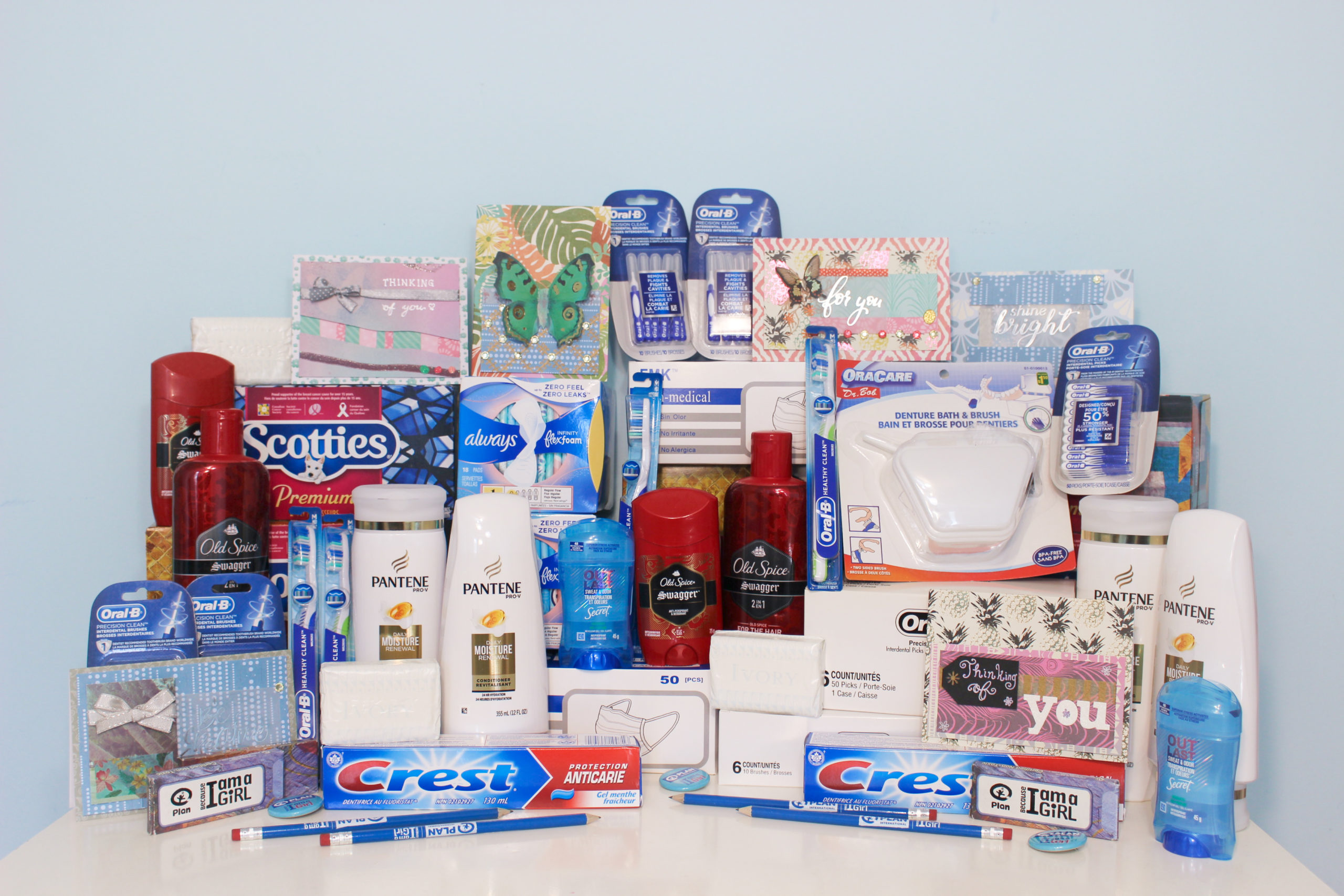 The packages consist of full-size shampoos, conditioners, toothpaste, toothbrushes, interdental brushes and picks, deodorants, bars of soap, pads, face masks, denture bath and brush sets, tissue boxes, pencils, crayons, balloons, pins, stickers, activity sheets, and handmade cards.